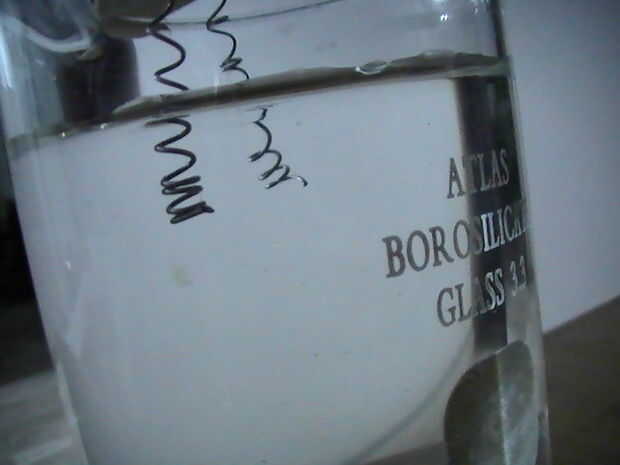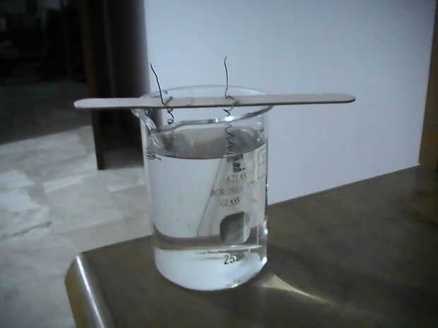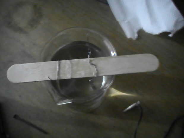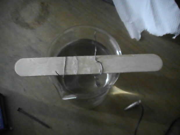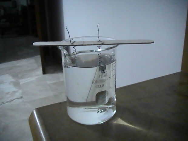 Lugar el palito con los electrodos conectados en la parte superior del vaso de agua. Asegúrese de que los electrodos se sumergen en el agua y que ellos no tocan.