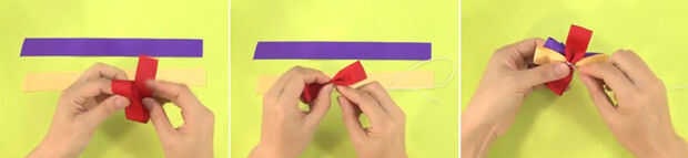 Sacar tres cintas en la misma longitud: rojo, amarillo y púrpura; doblar cada cinta a tres capas. Envuelva la mitad de la cada cinta con hilo. Doblar las tres piezas envueltas sin compromiso.