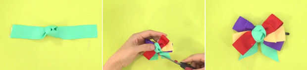 Realizar un nudo en el centro con una cinta verde. Atar la cinta verde anudada a las tres cintas con el nudo hacia arriba en el centro; fijar con pistola de cola caliente. Cortar los dos extremos de la cinta verde para líneas oblicuas; pegar un clip en la parte posterior de las cintas.