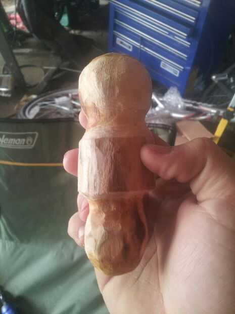 Luego pasó a formar la boquilla y acababa de formar una bola más pequeña. en la segunda foto. Me quedé todavía con una gran parte en el medio. Así que acaba de quitar la madera hasta un perfil más delgado que los dos extremos y boom! (tercera imagen)