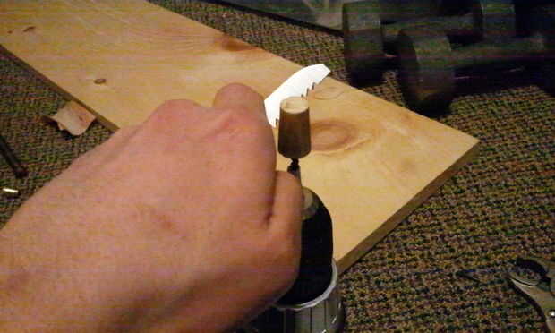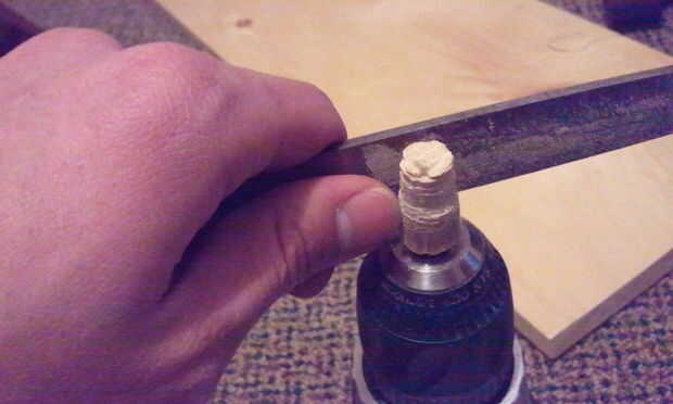 Tomar un identificador de archivo mini o cualquier cosa que es aproximadamente dos veces más ancha que la cáscara y los lados de la cuesta adjuntándolo a un taladro con un rompió apagado tornillo de madera, corte hacia abajo con una sierra y que archivo o arena suave.