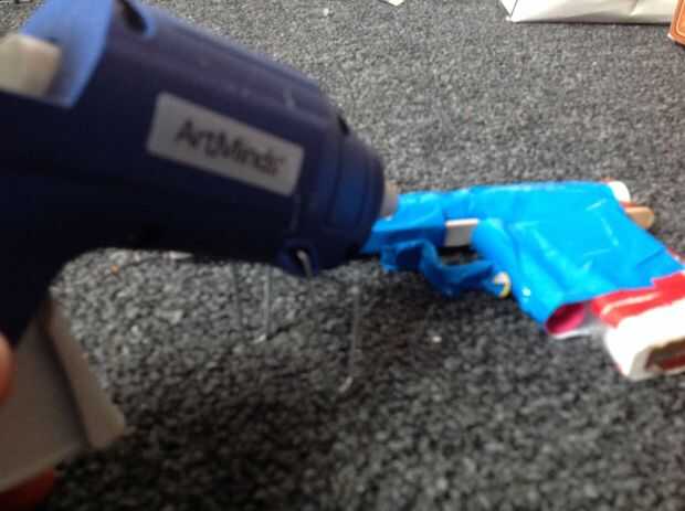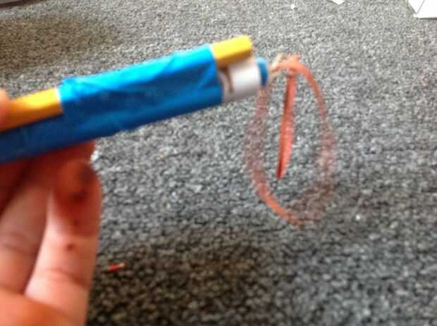Tome la caja de la pluma y hacer dos agujeros pequeños frente a la unos a otros 1 pulgada de la parte inferior. Tomar el clip binder y apriete para juntos una manija y quitar el clip binder. Tomar la gomas y deslizamiento entre los dos palos del clip binder mango y poner la manija en los dos orificios en la pluma. Deslice la pluma en el tubo del marcador con el clip de carpeta fuera y las bandas de goma para el marcador de cinta. Cinta marcador al palo popsickle. Tomar el clip de papel y cinta alrededor de la rap y doblar como imagen luego pegamento para mango y barril. Sesión tic tac deslizando un tic tac en la pistola y tire hacia atrás el lápiz y apuntar al objetivo luego soltar la pluma.