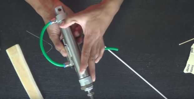 A continuación, había volteado boca abajo la válvula y había pegado su lado plano. Luego coloca el pistón en la cola y conectado un tubo de goma de la válvula en la parte posterior del pistón para que cuando el pistón se tira en forzará el aire en la válvula.