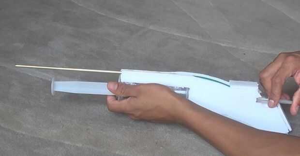 A fuego el comienzo de la pistola tirando hacia atrás el émbolo pequeño para que no obstruya el flujo de aire. Tire el émbolo grande completamente. Empuje el émbolo pequeño de nuevo en y luego cargar el cañón con el proyectil. Cuando esté listo para disparar, sostenga la jeringa grande con una mano y tire el émbolo con la otra mano. Una vez que la presión se acumula suficiente se disparará la pistola. Se requiere mucha fuerza para generar la presión suficiente para hacer fuego por lo que si no funciona Verifique que están exprimiendo lo tan duro como usted puede. Si todavía no puede conseguir que funcione trate de dejar a alguien que podría ser más fuerte lo de la leña. O para probarlo puede tirar el pistón grande entonces cuando la presión se ha acumulado tiene un amigo saque el pistón pequeño hacia fuera. Este fuego pero no con mucho poder pero es una buena manera de probar si usted está teniendo un tiempo difícil crear suficiente presión para hacer fuego