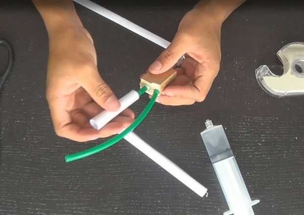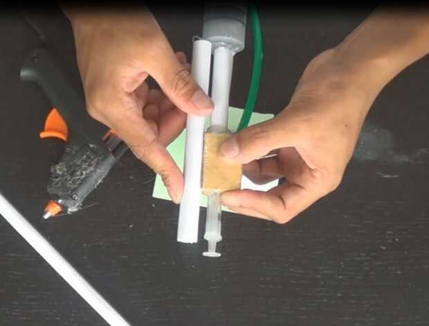 A continuación coloque el resto del pequeño tubo al bloque de madera y la jeringa grande. otra vez agregar el pegamento en ambos extremos por lo que la estructura permanece rígida