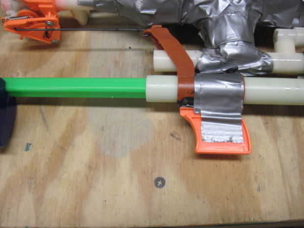 El siguiente paso es pegar el gatillo a donde usted lo desee. Puesto que la mayoría de pistolas de agua son diferentes, usted tiene que encontrar el punto que funciona mejor para usted. una vez que desee ese lugar, encolarla y (y si quieres poner en cinta aislante.)
