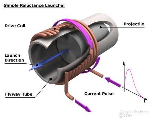 Una pistola de bobina trabaja girando una bobina en un electroimán y acelerar un pedazo de material de átomos (un proyectil) hacia un tubo a una velocidad alta.