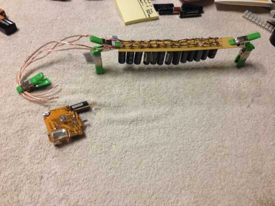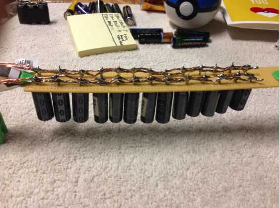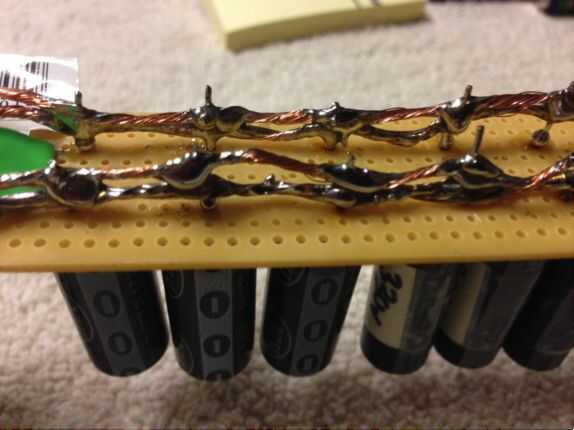 Lo que hice fue dividir el trenzado cable estéreo en el medio, pegar las conexiones de carga positivas y negativas a través de la división que hiciste, luego soldar en su lugar. Ello a lo largo de ambos lados, positivos y negativos, y esto debe hacer lo que parece 2 carriles. Este proceso lo hice dos veces porque no quería problemas de conexión, y quería que el Banco de capacitores para ser de la más alta calidad, porque también es la parte más peligrosa.