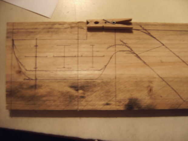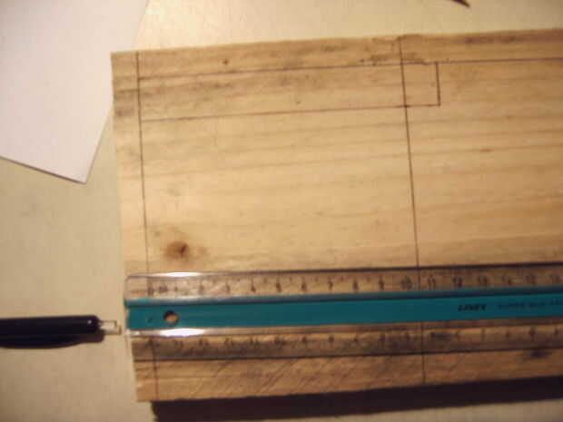 Después de eso decidí recurrir a mi madera. Empecé dibujando 2 líneas rectas de arriba hacia abajo que podría utilizar para asegurarse de que todas las líneas que se llamo en su recto. La primera línea recta también actuaría como la punta de la pistola. Empecé a trazar las líneas a partir de ahí con mi regla y las mediciones del bosquejo. (Foto 2)