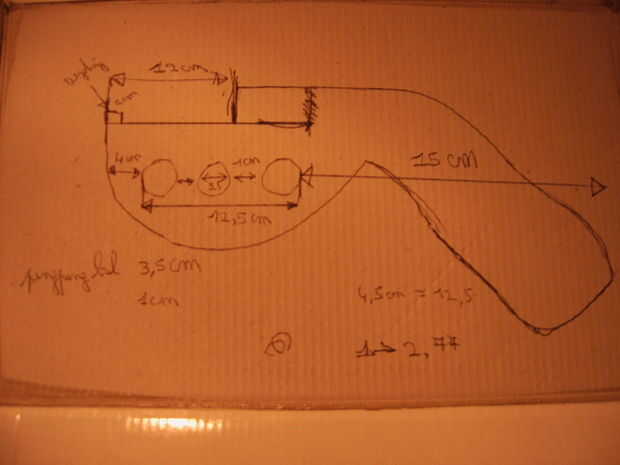 Tan pronto como tuve algo que se veía bien y las formas que se ajustan con simpatia decidí darles distancias. La manera que lo hice estaba haciendo mi bosquejo se ajustan. Así que el agujero de pelota de ping pong sería en el tamaño correcto hacia por ejemplo la manija. Empecé algo que sabía. Sabía que los agujeros de pelota de ping pong tendría que ser de 3,5 cm de ancho como mi pelotita de ping pong fue 3,5 cm de ancho. Desde allí sólo era medir y comprobar con la mano en la madera si cabe justo. (ponga su mano en el mango y ver si se puede mantener cómodamente)