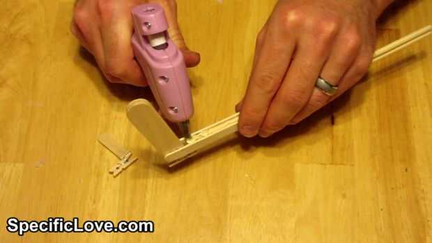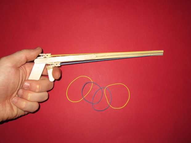 Si usted desea hacer esta arma con sólo palitos en lugar de los palillos, necesita 4 palos más y el otro palillo regular que se corta antes. Necesitará pegamento en un patrón de superposición para extender el cañón hacia fuera lo suficiente para conseguir el poder. Usted también necesitará agregar un pequeño trozo donde va el gatillo para dar a la pinza para la ropa algo de apoyo. Luego presentar la punta del cañón para sujetar las gomas.