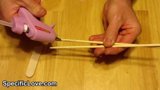 A continuación tomar un conjunto de palillos y encolarlos. Si tienen consejos flacos, es mejor colocarlos en la parte trasera de la pistola por lo que están ocultos. Asegúrese de no utilizar demasiado pegamento, o pueden atascarse a la superficie que está trabajando.