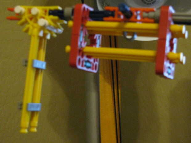 un conector naranja entonces poner una barra blanca en el centro de luego poner una barra blanca en los dos conectores amarillos del centro luego el conector naranja conectar como en la primera foto y tomar otra varilla blanca y adjuntarlo como en el segunda pic y luego colocar dos barras grises como en la tercera foto.