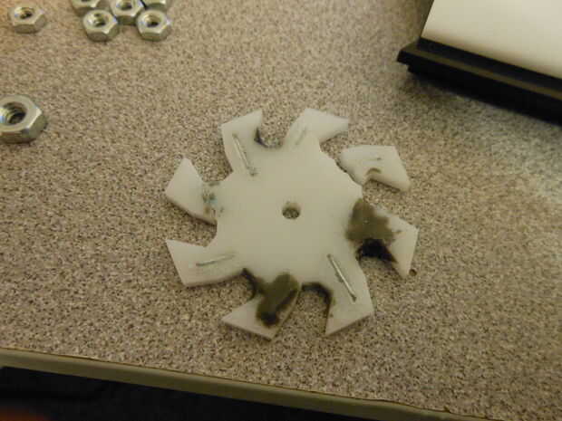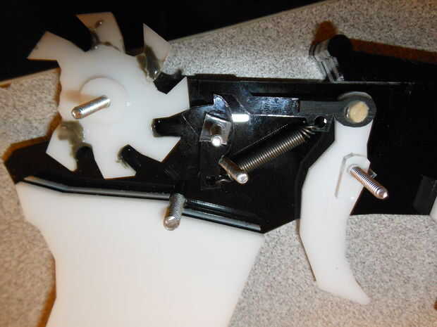 Las primeras imágenes muestra las tripas de la pistola de goma. ¿Observe cómo la parte giratoria con los dientes tiene gris goop sobre él y la pérdida de un diente? sí es mi intento de arreglarlo y tratando de obtener más rígido con epoxy y delgadas barras de metal. La segunda imagen es un cierre para arriba.