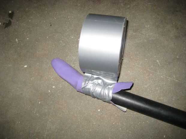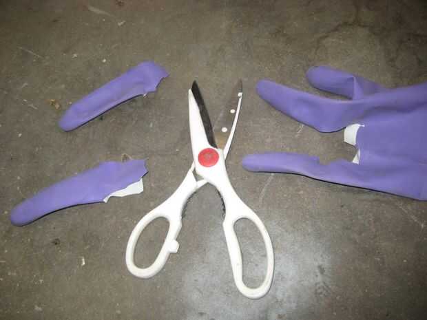 Cortar un dedo del guante de goma. Hacerlo como pueda. Recuerde que usted necesitará tanto goma como sea posible para anclar el dedo al cañón.