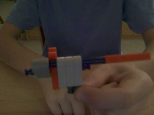 Inserte el mecanismo de disparo en el la parte posterior de la pistola y el lugar la banda de goma sobre el conector naranja y en la barra azul de la pistola sí mismo.