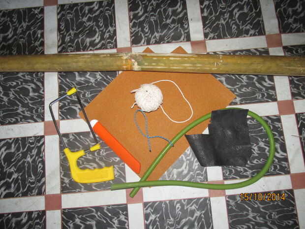 Para hacer esto usted necesitará un metro 1 a 1,2 de largo pedazo de ancho de 6 a 8 cm de bambú, una sierra o cuchillo de sierra, una longitud de 80cm de tubo de goma de 30-50 libras (la longitud depende de cuánto la goma se estira), un trozo de paño grueso o cuero, cadena, paracord, un cuchillo, un clavo grande o una clavija de madera.