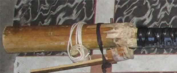 Si lo desea, puede hacer un soporte de pie para tirar de las bandas volver más fácil. Para hacer esto Utilice tubería de interior para mantener en su lugar unas longitudes de cadena o paracord hasta el final del cañón.