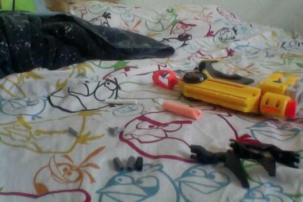 una pistola Nerf (una pistola, con la manija del pull-back)