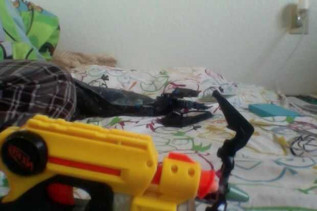 Primero necesita una pistola de nerf de cualquier tipo, luego necesitas una bala de nerf y una pluma, entonces necesita un par de tijeras y airsoft balas. necesita tirar de los extremos de la pluma y la punta de la bala de nerf. Ahora tienes que y pu