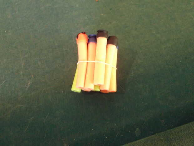 Ahora, tome la banda elástica y Envuélvala alrededor de los 12 dardos nerf gratis