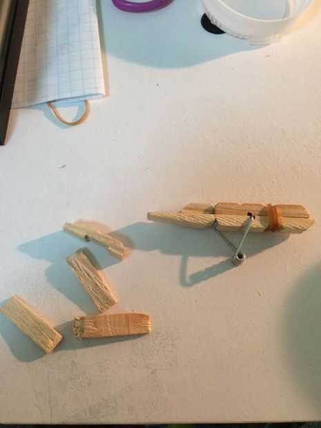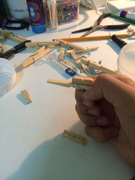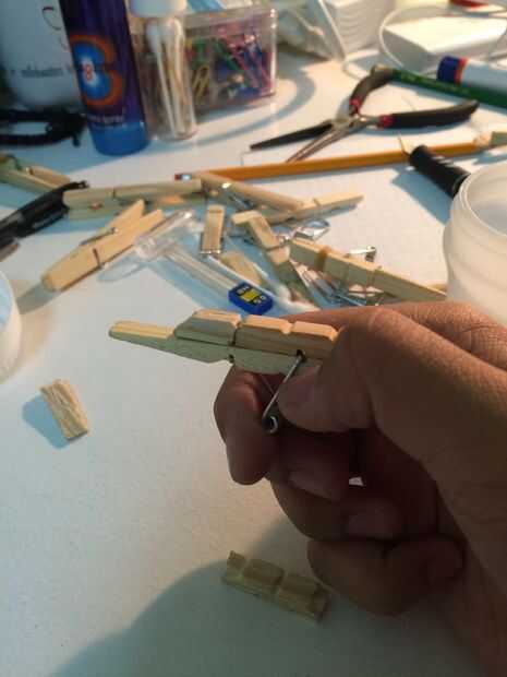 esto es una mini pistola con una sola pinza de madera, un pedazo de popslicle para hacer algunas partes más plano. También usé un tubo de bolígrafo vacía para dar mayor precisión y hacer un asa para tirar hacia atrás el gatillo de metal.