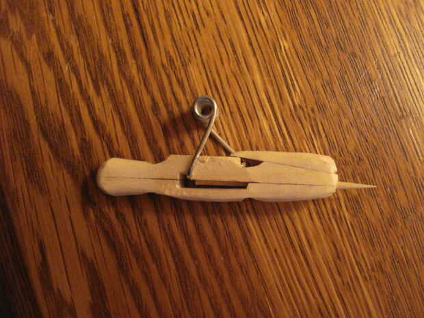 se necesita:Una pinza de ropa (madera)1 banda de cauchoHerramienta de corteHerramienta de la marca (opcional)Paso 1: Desarmar la pinza de ropa Simplemente deslice la parte superior de la pinza de la primavera. Y simplemente sacar el resorte. Ten cuid