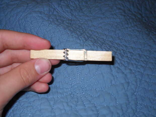 Ahora es fueron se pone un poco complicado. Lo que eres bonita mucho hacer es poner el metal en uno en el otro lado. Más pinzas para la ropa en la pieza de metal tienen una corta parte y larga parte, asegúrese de que la parte corta está en el piso o afuera y el largo en el tropieza o dentro de la clavija de ropa. Una vez más es más fácil deslizarse sobre pero tipo de abrirlo. La primavera como parte debe ir hacia el la punta y la parte larga no será en una ranura.