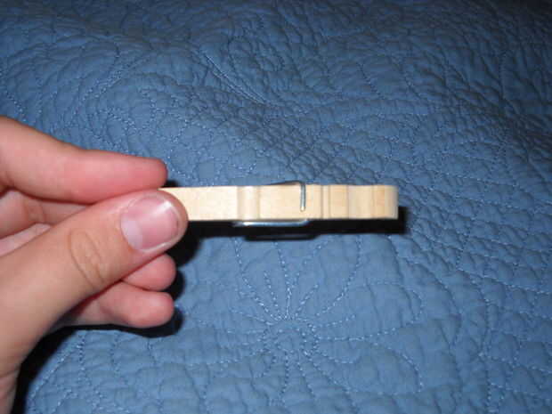 se necesita:Una pinza de ropa (madera)1 banda de cauchoHerramienta de corteHerramienta de la marca (opcional)Paso 1: Desarmar la pinza de ropa Simplemente deslice la parte superior de la pinza de la primavera. Y simplemente sacar el resorte. Ten cuid