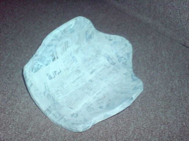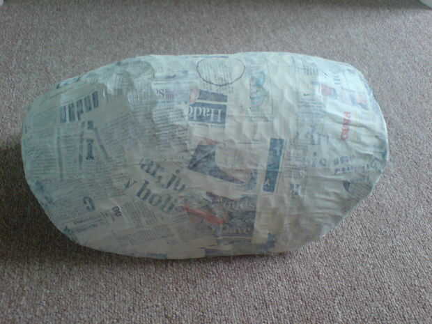 Con la cubierta frontal, construí formas con plastilina para espesar la cáscara y añadir profundidad. El big shell no la necesitaba por lo que quedó como alambre. Cada depósito es entonces recubierta de varias capas de tiras de periódico y una mezcla de 50/50 PVA pegamento y agua. Se puede utilizar resina de fibra de vidrio si querías más fuerza pero el periódico es tan bueno y fácilmente disponible. Utilizar pequeñas tiras de papel para prevenir arrugas y cubrir uniformemente con la mezcla de pegamento con un pincel (como en Art Attack). Esto es particularmente crucial en la concha grande para conseguir un acabado liso con curvas. Cubierta de la cáscara de mango en ambos lados pero la cáscara grande sólo necesita cubierta en el exterior.