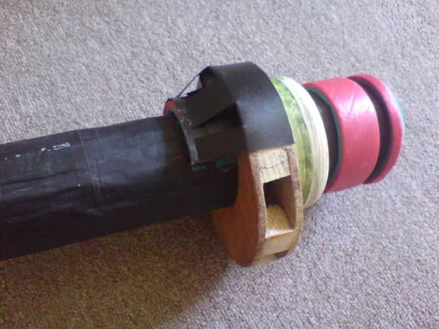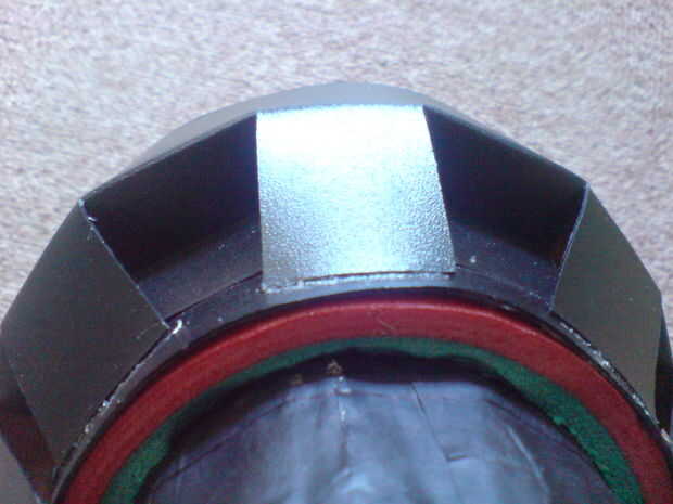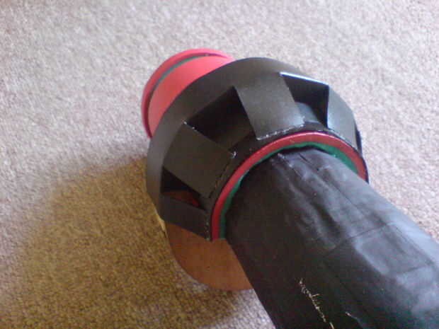 Un rectángulo de plástico lo suficiente cubrir la curva superior y la mitad de todo se corta. 9 ranuras se cortan para que el plástico puede doblar alternativamente entre recta y en forma de L para formar las ventanas. Puntuación de la parte posterior de la ayuda de plástico pliegue bien. Otra tira de espuma estuviera pegada al barril por debajo de la plástica para dar la profundidad. Todos los pliegues están calientes encolar, por lo que quedan.