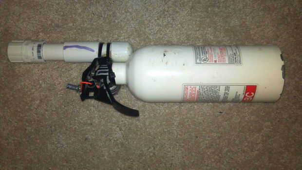 Ahora que sabemos cómo funciona este cañón de aire, vamos a construirlo! Este es un build bastante fácil y debe ser rápido y sin dolor. En primer lugar, obtener su extinguidor. Si se trata de un nuevo uno spray todo el polvo hacia fuera en un balde hasta que toda la presión del aire se ha ido. Luego, destornillar la válvula de la botella y vacíe todo el polvo restante. Corte el tubo de plástico conectado a la válvula y luego vuelva a enroscar la válvula tan ajustadamente como sea posible.
