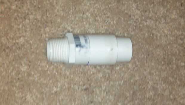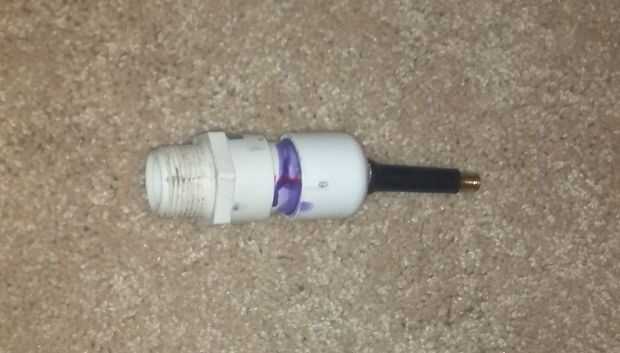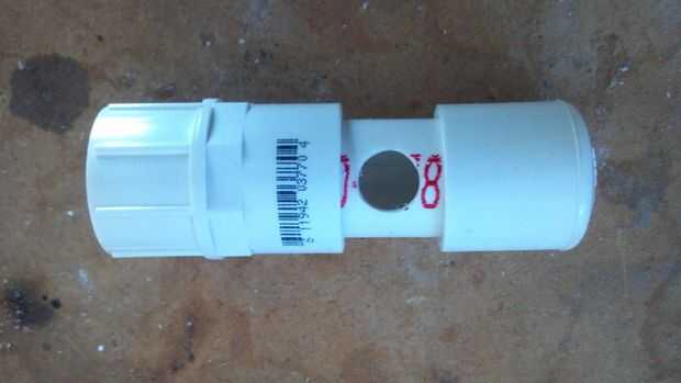 Poner la válvula Schrader en el centro de la cubierta del extremo del PVC 3/4". Pega este a 3/4" macho Adaptador usando una pequeña sección de tubo de 3/4". Entonces, pegan su otros 3/4" adaptador macho y el reductor de 3/4" - 1/2" entre una pequeña sección de tubo de 3/4". Con estos dos accesorios, podemos llenar el cilindro con aire y conectar el cañón.