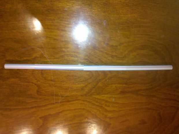 Deslice su primer corte de paja en la paja sin cortar. Cuando deslice en la la paja cortada, debe haber un pequeño espacio entre los dos bordes, esto es normal. Ahora deslice su segundo corte paja sobre las otras dos pajas, solo que esta vez el que corta la línea es en el borde opuesto.