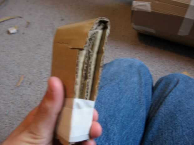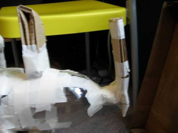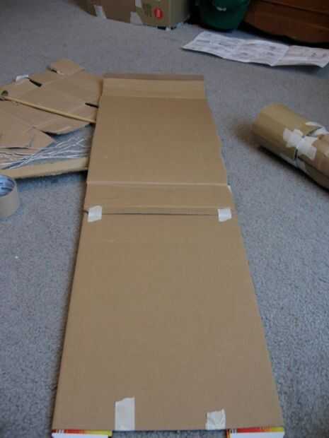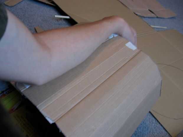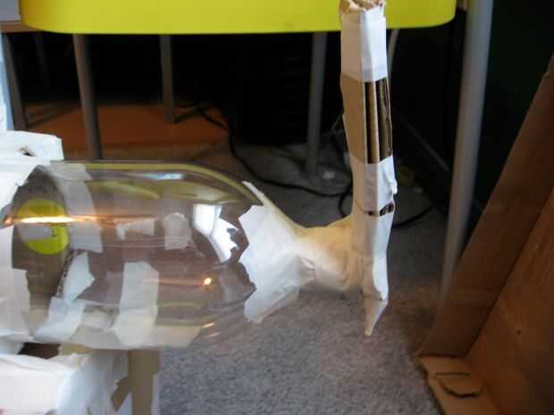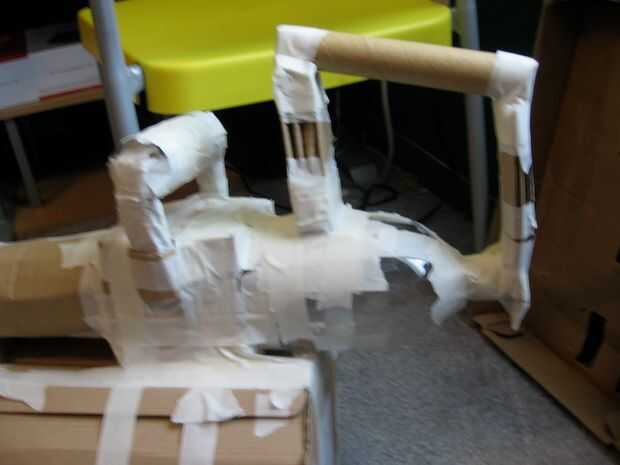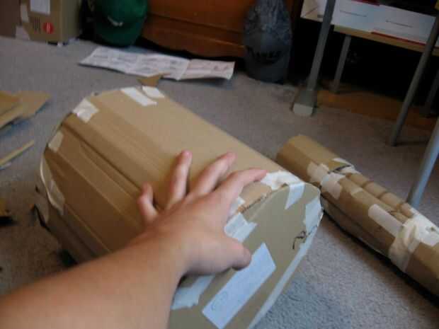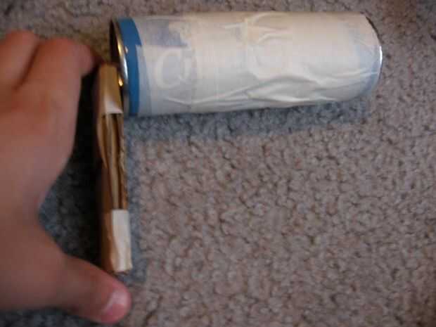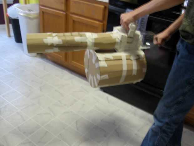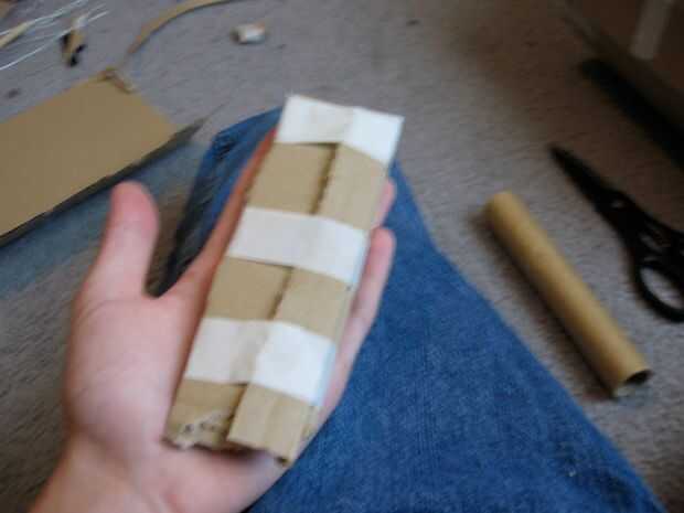 Again, looking below helps. Lo que tienes hasta ahora y añadir un asa a él. Para ello, tomando una tira de espesor de capas de cartón 4, cortar la mitad y agregar a su tubo de vacío rodillo crescent. Añada a su mini pistola.