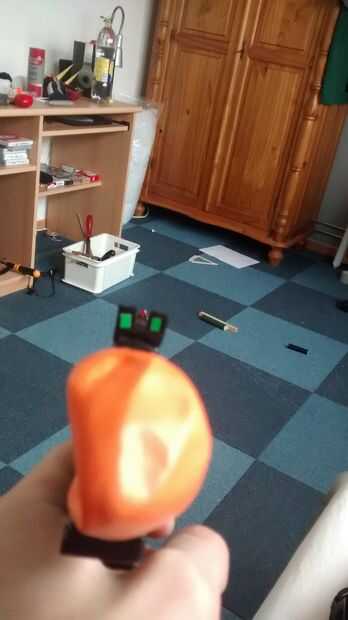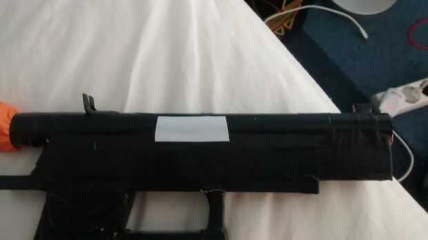 Coloque el tubo de pvc en el lugar donde generalmente es la diapositiva y grábelo en su pistola. puede que desee añadir una cinta de capa extra porque se puede romper si disparas la pistola.