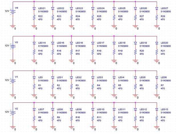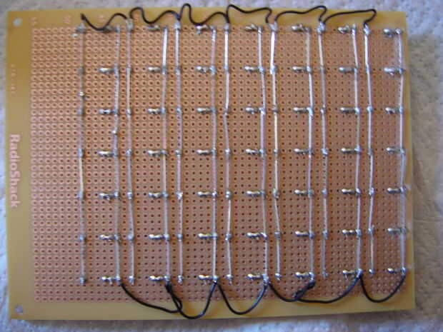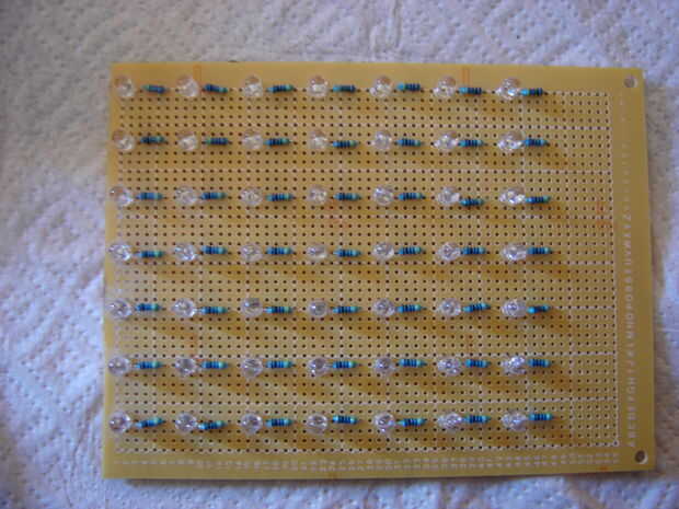 La imagen de abajo muestra cómo Monnie arreglado los LEDs de las breadboards comprados en RadioShack. Nos espaciadas los LEDs por 6 agujeros por todos lados.