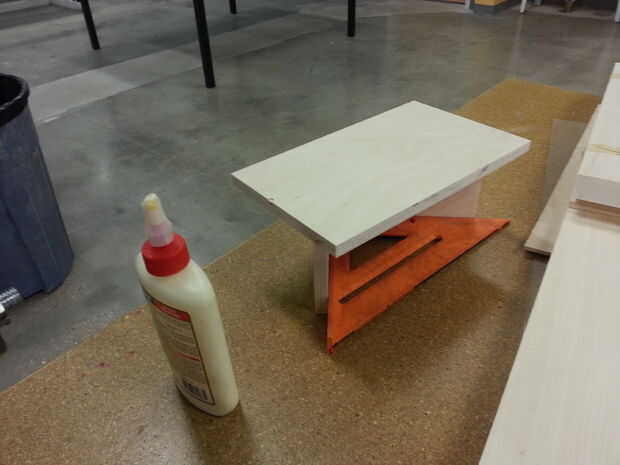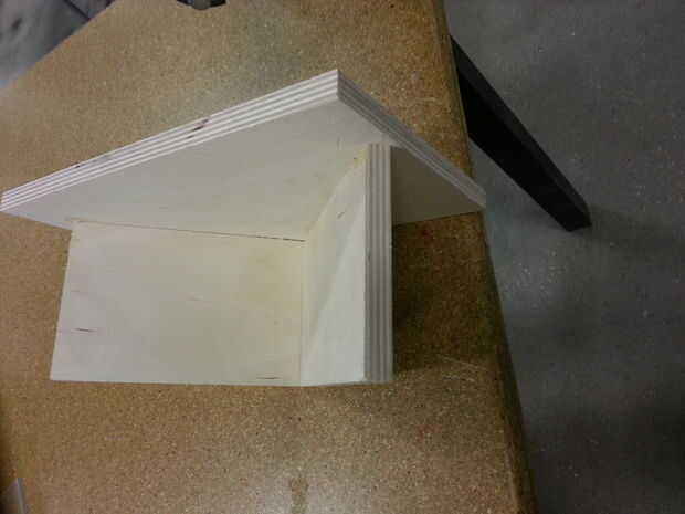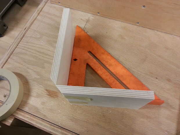 Uso de los dos tableros para la cuna, con cinta adhesiva como se ve en la imagen siguiente para que los ángulos de 45 grados son exteriores. La cinta temperally celebrará los tableros juntos para que la cuna se puede alinear correctamente en un ángulo de 90 grados (utilicé un cuadrado de la velocidad para ayudar a este proceso). El corredor puede sujetarse con clavos y pegamento a la base. Usé a una clavadora para colocar 2 clavos en cada lado, asegurándose de que los clavos se colocan lo suficientemente altos como para que la hoja de Hanon no cortará las uñas accidentalmente.