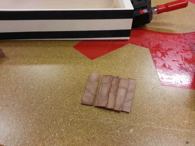 Ahora que se han cortado las ranuras en la pieza de trabajo. Utilice piezas delgadas de madera para colocar en la tira, cortar mina en la Sierra de cinta con restos de madera. Diverso color (spieces) de madera funciona muy bien para que tus estrías se destacan. Seco ajuste sus tiras para asegurarse de que forma, si son demasiado apretadas arena las ranuras para que les ajuste suave - esto permite que el pegamento de la spline y no Haz empujado hacia fuera. Con el ajuste seco hecho, agregar pinza y pegamento de madera. Utilizar restos de madera entre la pieza de trabajo y para proteger la pieza de trabajo (ver foto).