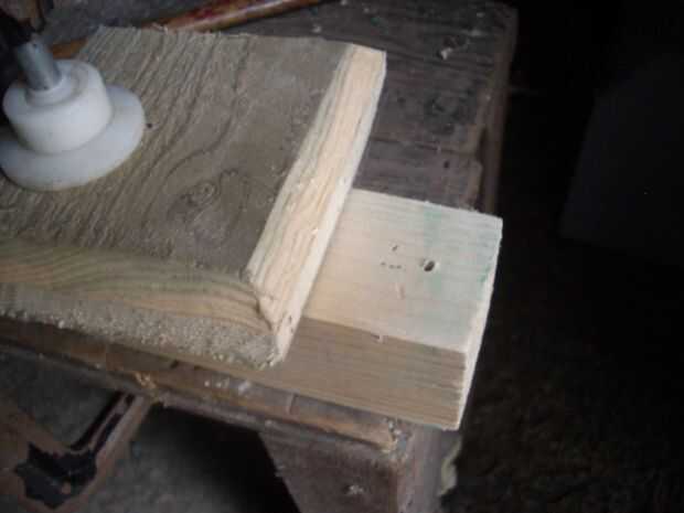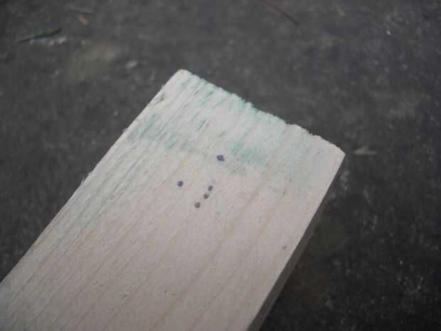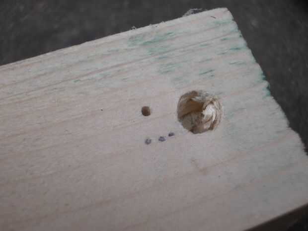 Sujete la madera a un banco, usando un trozo de madera debajo de la quijada de la abrazadera para evitar marcar la madera. Perfore un orificio piloto con la broca pequeña en el centro del círculo donde el pasador pueda y luego perfore otro agujero donde irá el clavo más grande. Bajar aproximadamente media pulgada (12mm) para el pasador, un poco más para las uñas (pero tener en cuenta el espesor de la madera - no perfore a través de él). Utilizando la broca grande, perfore el orificio para el pasador.