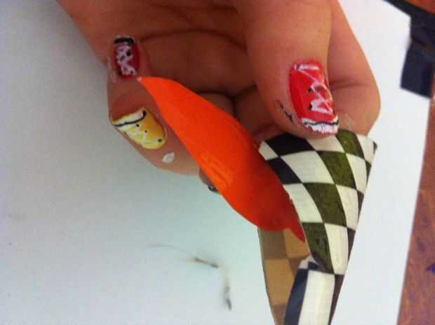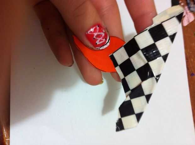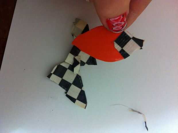 Un pedazo de cinta adhesiva decorada y la esquina de la misma en la pluma. Dobla sobre y la otra esquina en el lado opuesto. Aplanarlo. Corte la parte del tallo de la pluma.