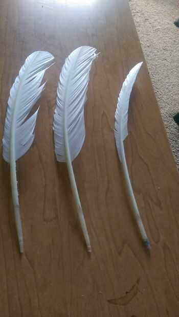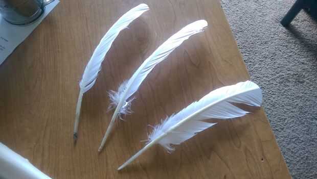 1) eliminado los "afterfeathers" y parte de la paleta despojados para comenzar más arriba en la pluma. Puede ser desplumados lejos en su mayor parte, aunque utilizo mi cuchillo Xacto. El objetivo aquí es obtener mucha de la pluma fuera del camino de la mano al escribir.