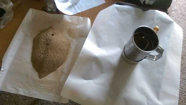 3) al elegir un parche de arena a pala de, tratar de no cavar muy profundo; el cribado será la más húmeda la arena, la más difícil. (Además, porque nos habíamos conseguido algunas lluvias en nuestra zona como estaba abordando este proyecto, que terminé tener que hornear mi arena en el horno para que seque rápidamente. Era tan simple como separar hacia fuera en el papel de pergamino en una hoja de la hornada y ponerlo en el horno hasta que había precalentado a la temperatura requerida. Luego tamiza otra hora o dos para eliminar las partículas más grandes que se habían deslizado a través de. Si utiliza este método, ten en cuenta que la arena estará muy caliente! Tenga cuidado al manipularlo.)