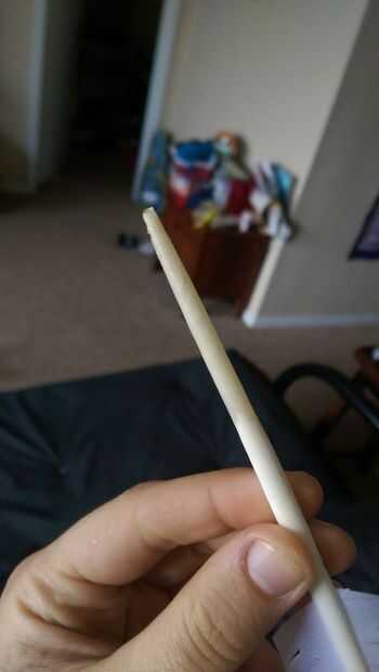 En mi experiencia, tardé aproximadamente una hora y media para este paso. Debido al tiempo extendido aquí, prefiero a tres o cuatro plumas a la vez. Usted debe ser capaz de ver una diferencia clara entre la coloración de un templado y un cálamode mezcla. Mientras no tenga una imagen de este último, puede ver que el eje templado es más opaco que antes, y doblará menos en la mano.