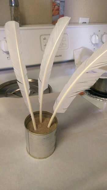Para moderar su pluma, comience por poner su lata de arena en el horno a 350 grados Fahrenheit por 15-20 minutos. Mina me la puse encima de la bandeja para hornear y pergamino que previamente había utilizado para la cocción de la humedad residual de mi arena. Cuando la arena está lista para salir del horno, usted puede pegar los ejes de sus plumas preparadas hasta en la arena como se encajan. Aquí permanecerán hasta que la arena se enfría a una temperatura segura.