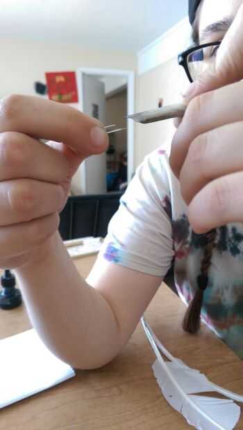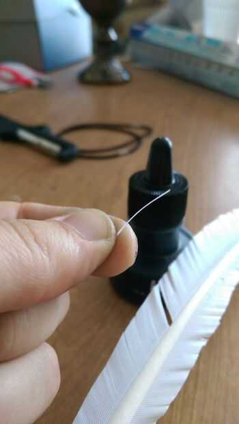 Un truco del comercio utilizado como medio para ampliar su carga de tinta, algunos fabricantes de pluma tome un diente o dos de sus plumas e introducirlo en el extremo de su pluma. Este pequeño pedacito de pluma permite que la vaina sostener una mayor carga de tinta, lo que le permite pasar más tiempo sin mojar su pluma. Aunque no es necesario, he encontrado que esto aumenta grandemente la cantidad de escritura que puedo hacer en una sola inmersión.