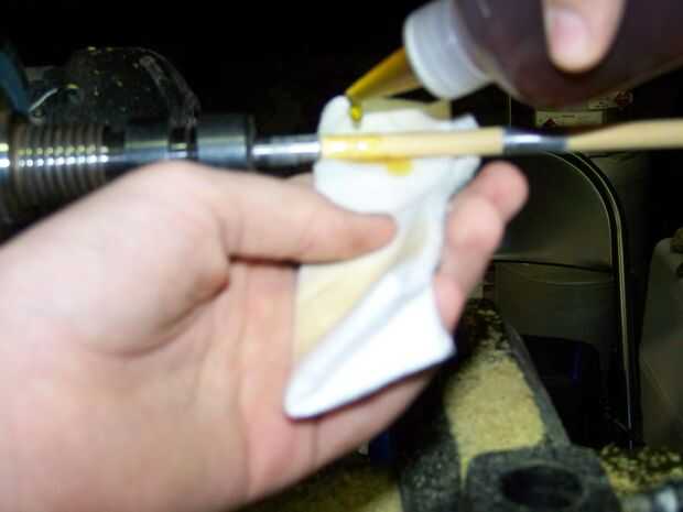 Antes de arena lenta hacia abajo de su torno como lento como sea posible para el resto del proceso. Después de que haya arena de torneado con no menos grano 220. Hacer su camino hasta grano 400 y luego mirar sus espacios en blanco. Una buena manera de ver si haya lijado es ejecutar los dedos en el espacio en blanco con el torno. Se pueden saber a mucho más con los dedos de los ojos. Después de que su blanco es suave y al ras con los bujes tomar tu BLO (aceite de linaza hervido) y poner un poco en una toalla de papel y frote bien luego mira qué hermoso será su pluma. Esto es más o menos cómo el lápiz parecerá cuando listo excepto que será 100 veces más brillante.