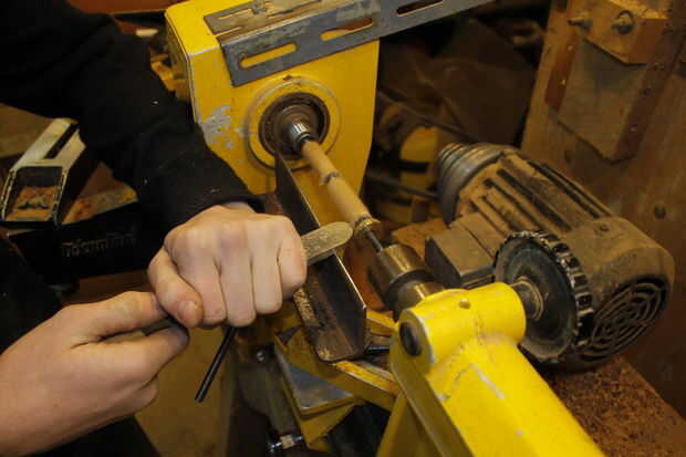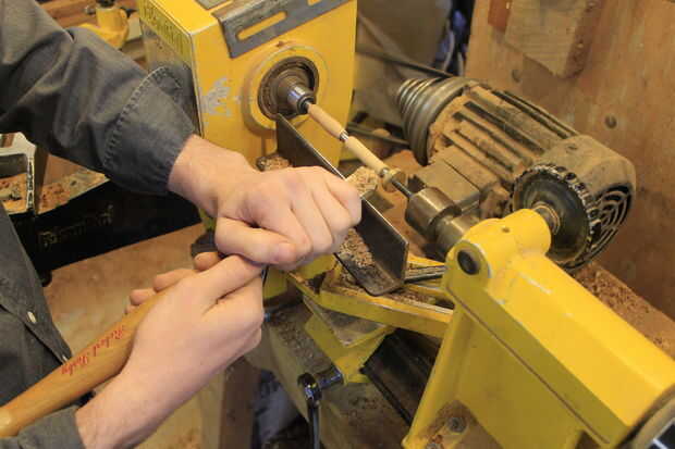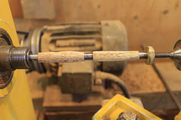 Poner en marcha el torno y sus dos trozos redondos de madera.