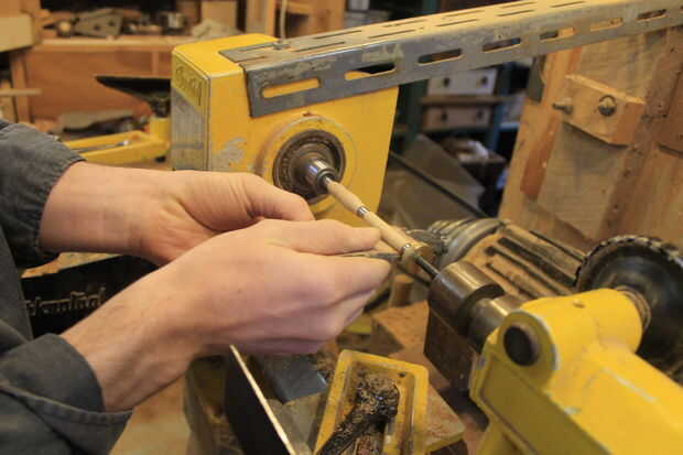 La arena encima de sus dos piezas de madera para que la madera quede al ras con los casquillos de metal. Empecé con papel de grano arena 100 y mi camino hasta un buen grano 600.