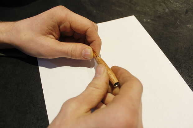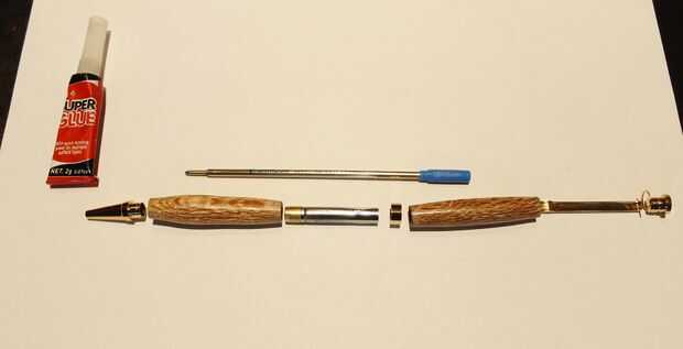 Alinear todas las piezas de pluma y conecte la punta de la primera pieza de madera. Generalmente no necesita unir un bolígrafo como una presión de ajuste debe, sin embargo mina era tan flojo que había yo no pegué, la pluma hubiera derrumbado.